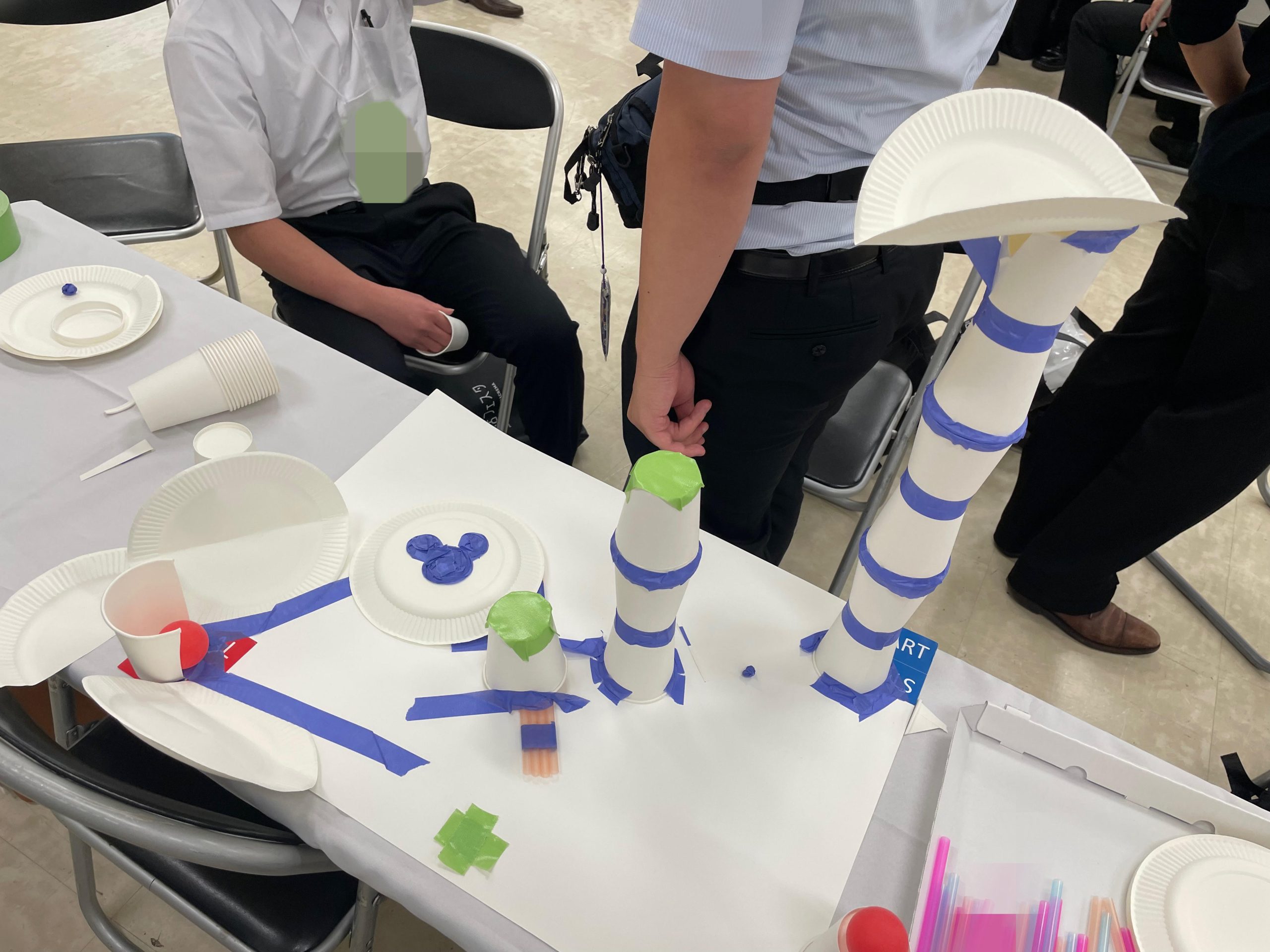 スタート地点のピンポン玉をゴールへ運ぶ「仕掛け装置」を、限られた時間内で学生と協力して作り上げる、というワークでした!