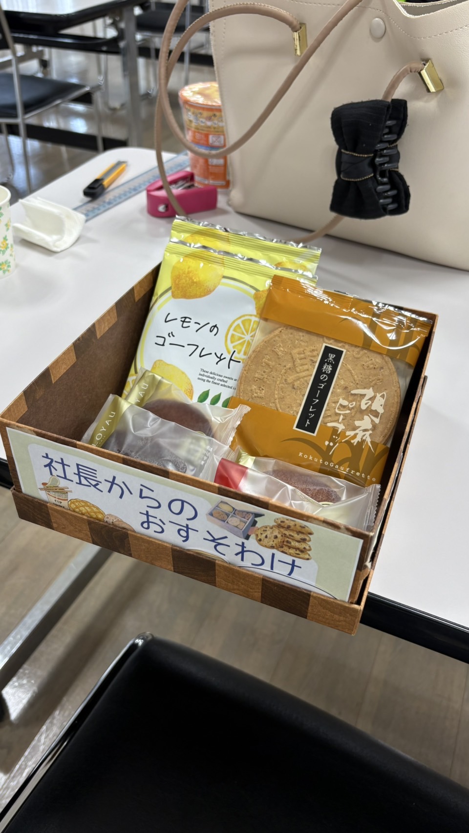 社長のおすそ分け(新入社員限定バージョン)をいただき、みんなで休憩時間に分け合いながらエネルギー補給。疲れた体と頭に染みわたり、作業の手も軽く感じられました😋