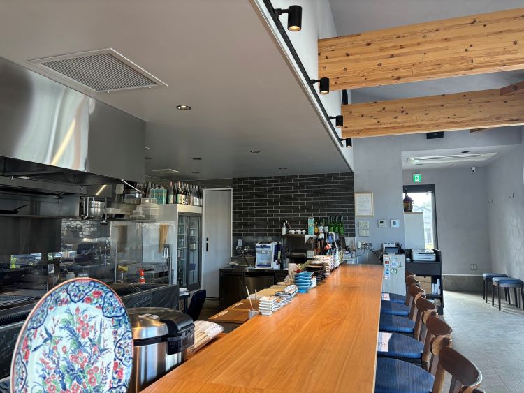 調理の様子が見える開放感のある空間で、ゆったりとしたカウンター席が並んでいます。