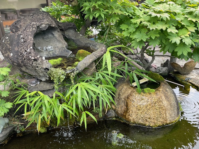 訪問先のお庭では、庭石の上にちょこんと並ぶ6匹の石のカエルたちのお出迎え。