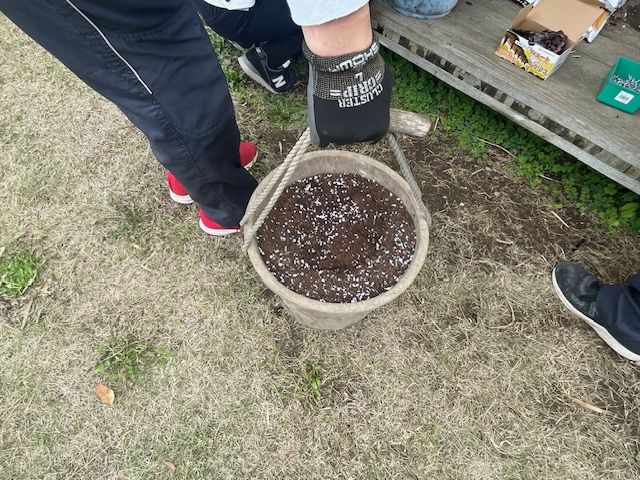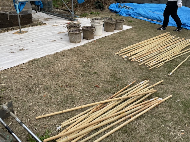 竹を取り付けるメンバー、竹や土の準備を進めるメンバー、