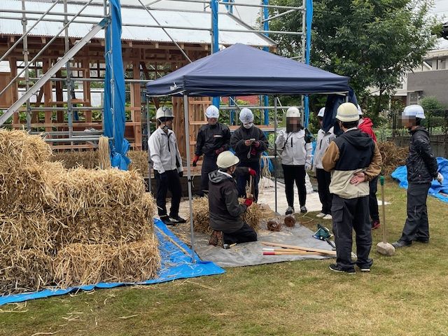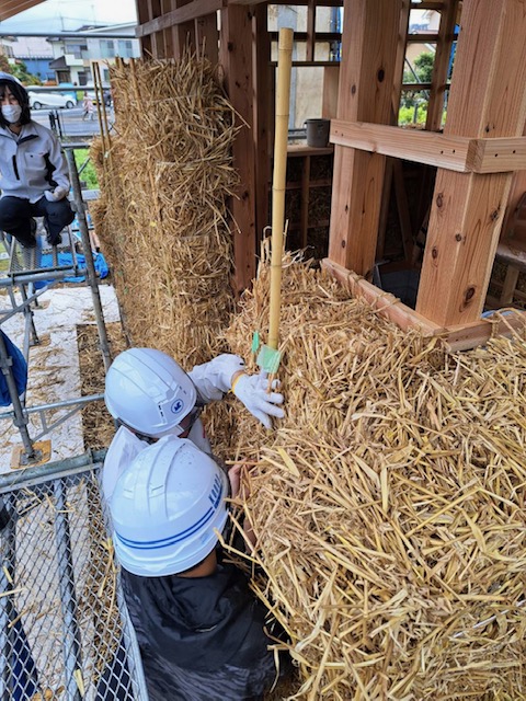 「ストローベイル(藁)」の取り付け作業がスタートしました。