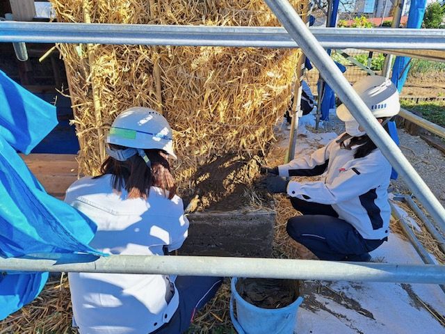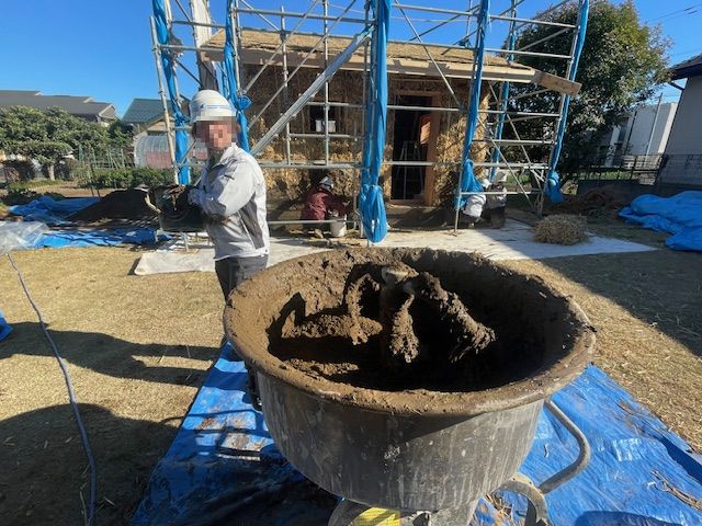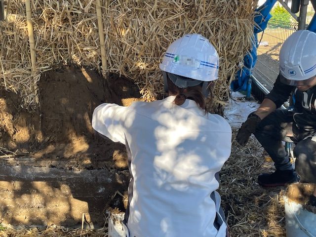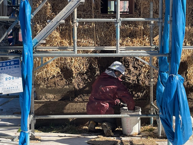 土を塗るたびに、藁の壁がしっかりと形を帯び、完成に向かって一歩近づいていく。