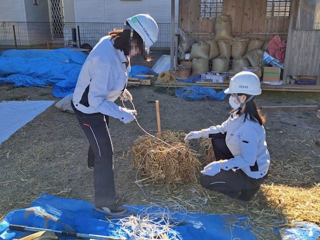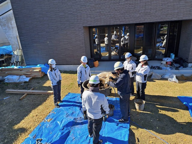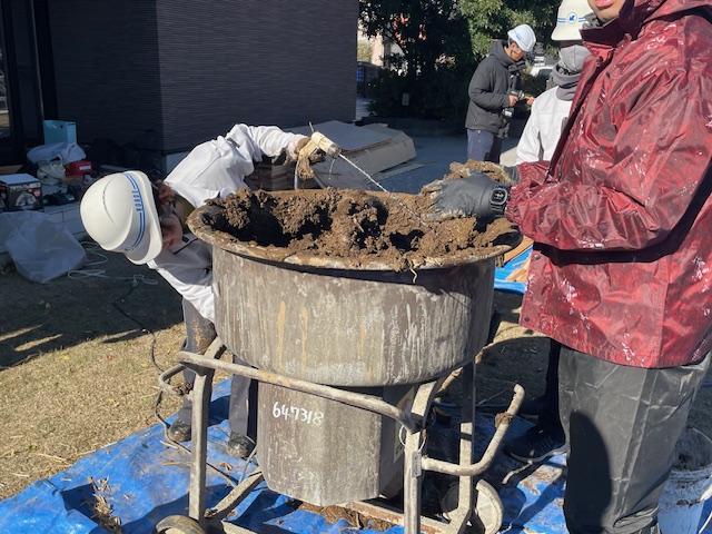 前回までに積み上げた外壁の藁に、今回は下地となる土を塗る工程です。