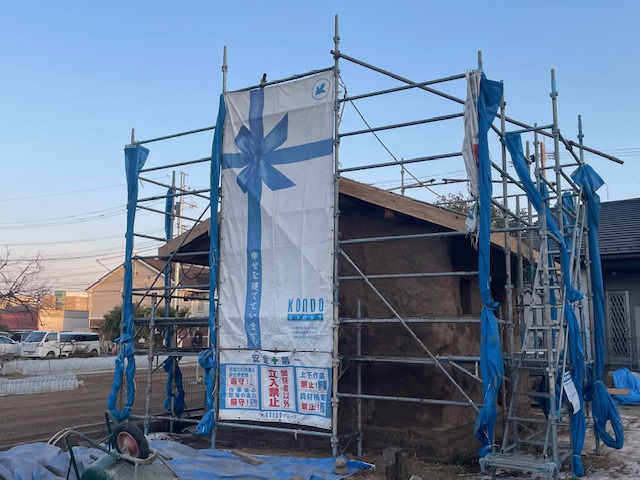 現在は外壁の土壁塗りがほぼ終わり、4月の完成に向けて最終段階へと進んでいます。