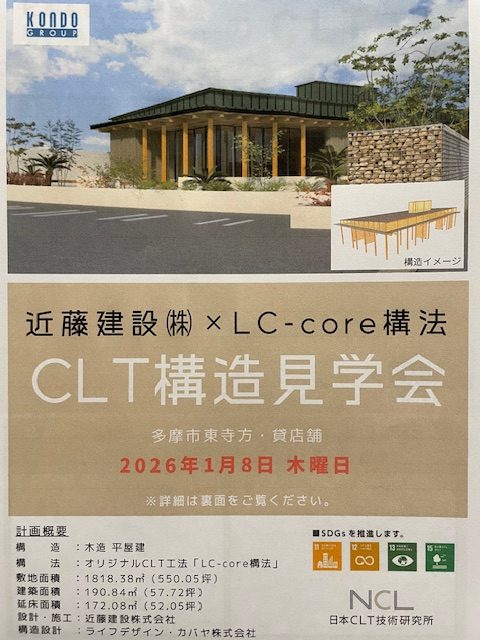もう一つは、東京都多摩市で施工中のCLT構法によるコーヒーショップの構造見学会です。