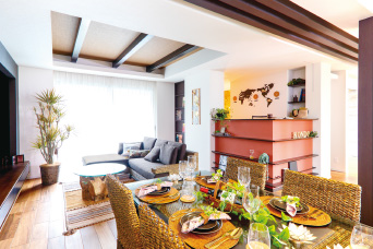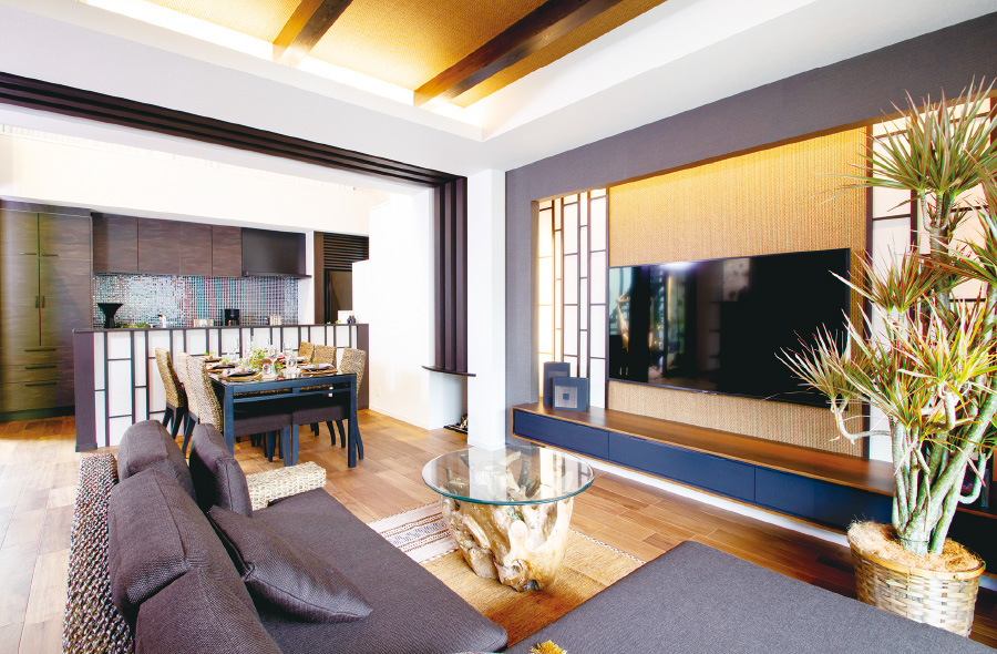 アジアのリゾートホテルの様な癒やしの空間を住まいの中に取り入れる方が増えています。木材の骨組みや竹や籐の家具、麻などのファブリックなど天然素材をインテリアに使う事で癒しの空間を演出しています。更に高温多湿の気候に合わせて窓の位置や庇による採風・日射コントロールが必要です。KONDOでは地元企業だから知っている地域の特性を取り込む事で、快適な住まいのヒントをご提案しています。