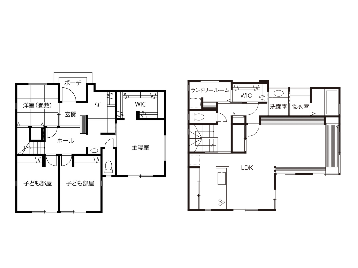 主寝室や子ども部屋などのプライベートな空間は1階にレイアウト。2階には開放的なLDKと、水まわりが集約して配置されています。