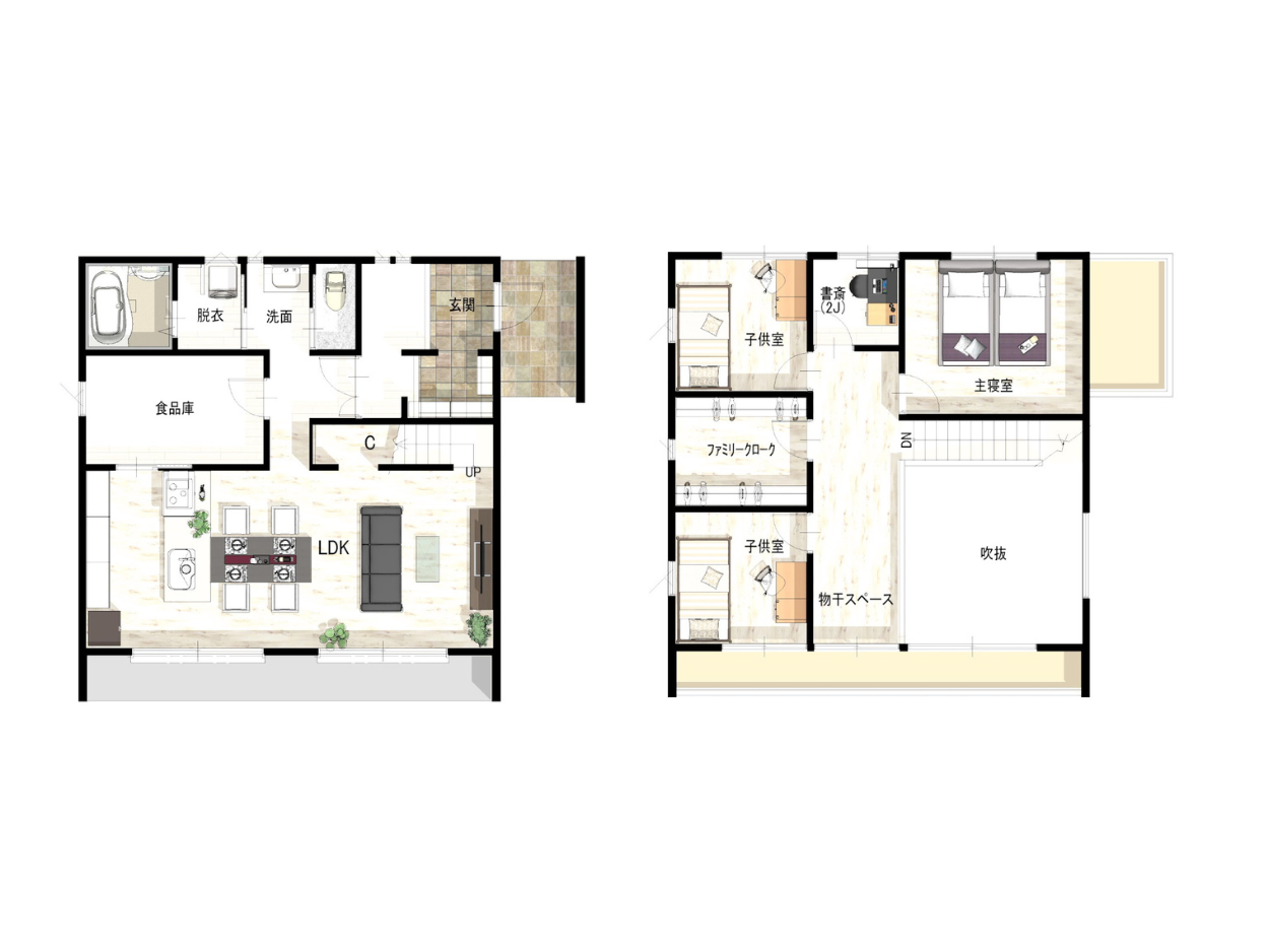T様のこだわりは、「家のあちこちに収納を設けるのでなく、モノをまとめてしまえる大型収納がほしい」というものでした。そこで担当建築士が、1階にはキッチン直結の“大型パントリー”を、2階には家族全員分の衣類を収納できる“ファミリークローク”をプランニング。食品ストックの一括管理で重複買いがなくなり、モノも迷子にならない、快適なお住まいとなりました。