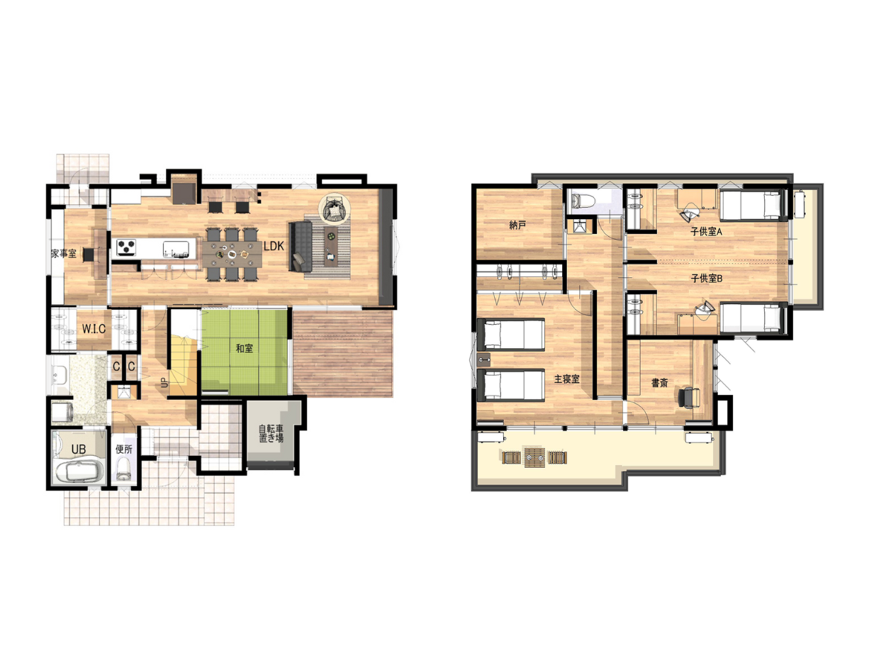2階には主寝室と子ども部屋2室をゆったりと配置。トイレを出たところには洗面台を設け、お子様もトイレの後に、石鹸を使ってしっかり手洗いする習慣が身につくよう工夫しました。