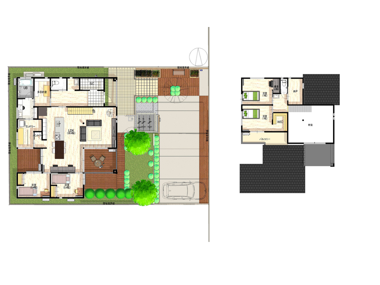 一般的には2階に設けることが多いお子様部屋を、1階のLDKの隣に配置したことで、お子様たちも家事のシェアがしやすくなりました。モデルハウスのような重厚感と風格を備えながら、機能的な動線や収納空間にも配慮。2つのウッドデッキも暮らしに潤いを与えてくれます。