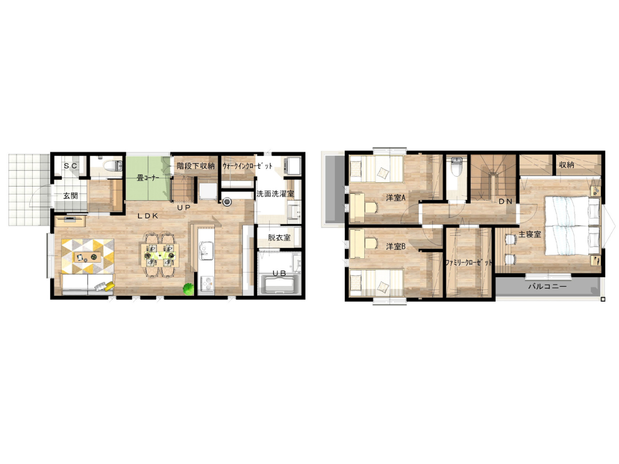 「主寝室は、トイレや子ども部屋と離したい」というI様の希望で、担当建築士がファミリークローゼット(FC)を中心に、個室を振り分けて配置しました。大容量のFCは中心にあることで家族共用の物をしまうのにも便利です。各部屋にも収納を設け、お部屋をスッキリと使えるよう計画しました。