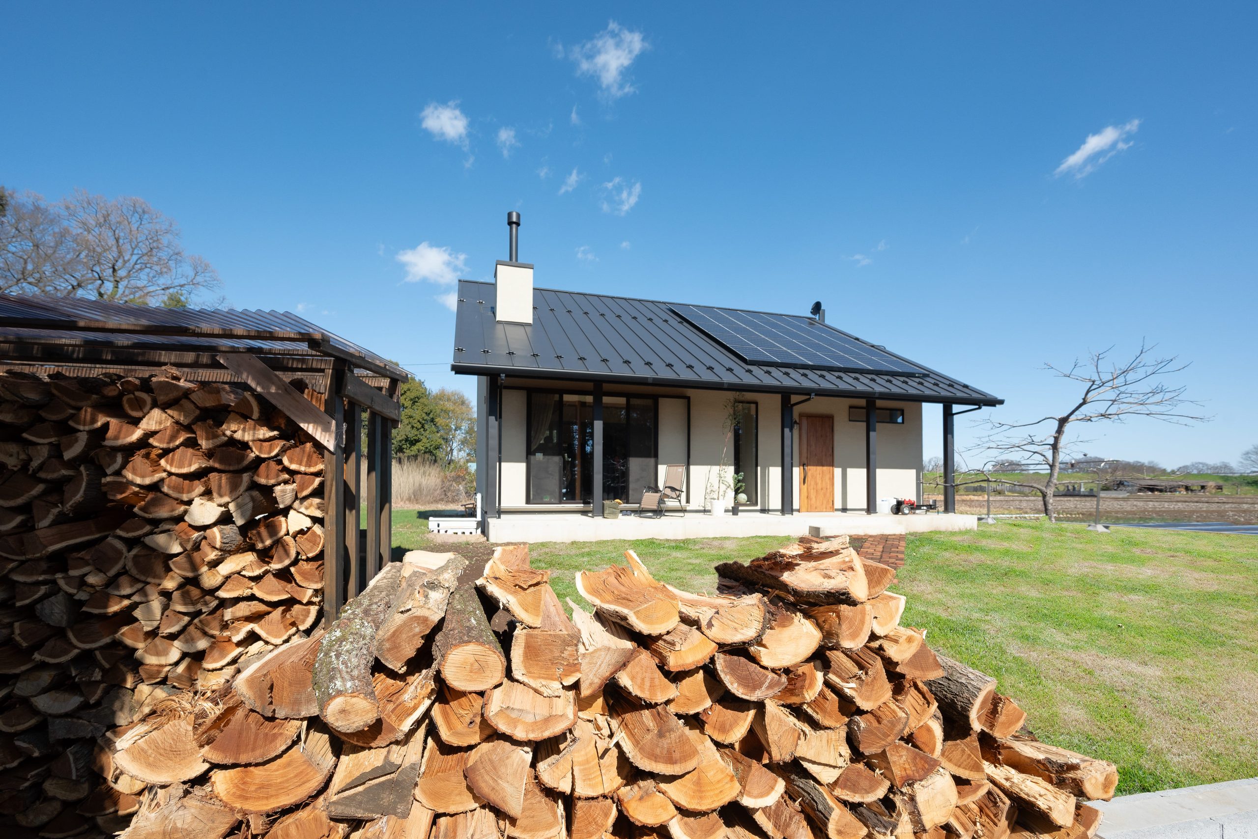 薪づくりも自然の中での暮らしの楽しみ、というF様。庭の薪小屋にぎっしり積まれた薪も、全てご自身で割ったものです。薪ストーブは優れた暖房器具であるだけでなく、炎の揺らぎがもたらす癒し効果も魅力です。知識も経験も豊富な建築士が、断熱性や通気性などに配慮して安全に設置しました。