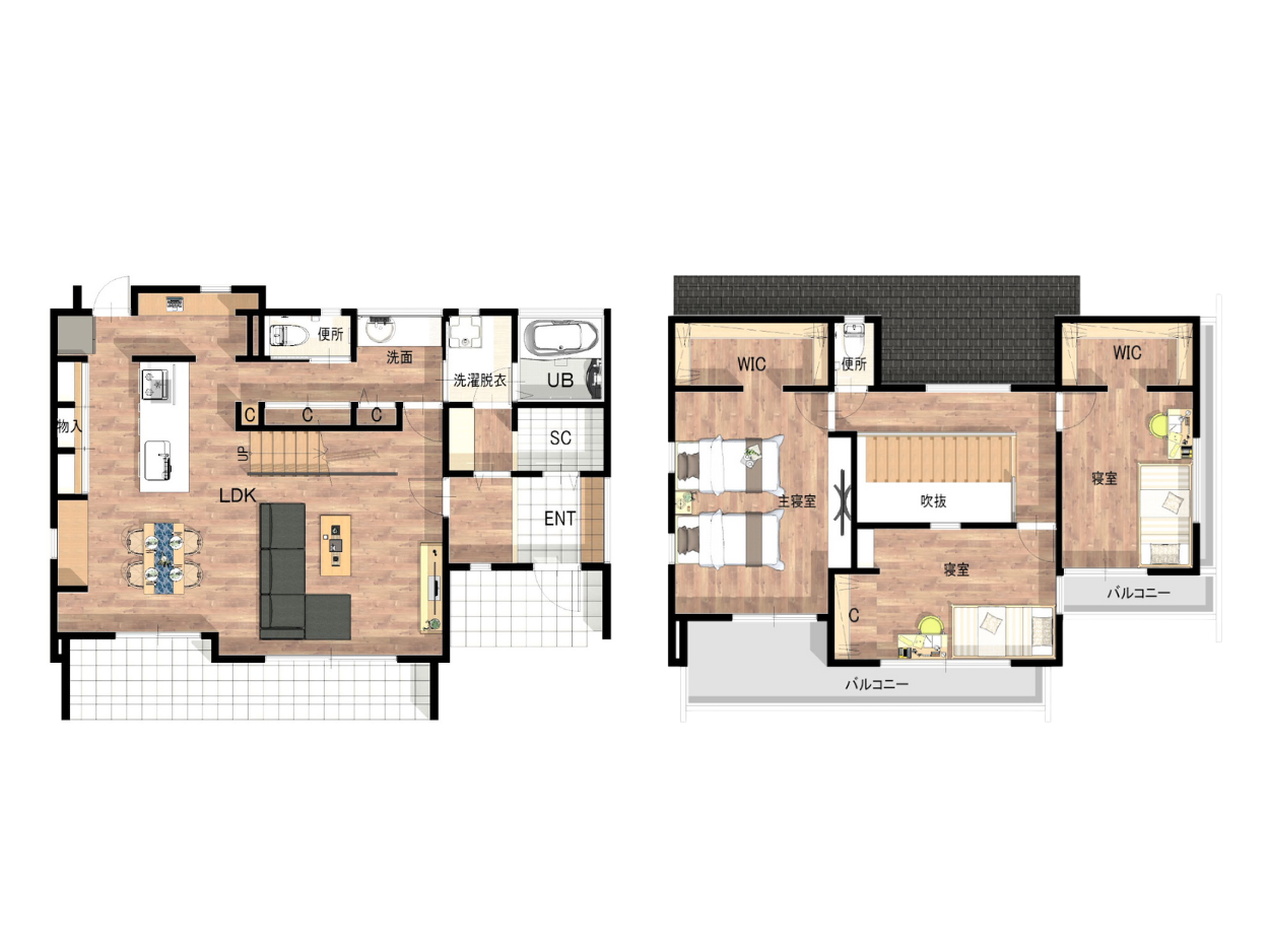 二人のお子様のお部屋です。 ご子息のお部屋は青色のおアクセントクロスを一面に貼りました。本棚を作りつけ、全体的にすっきりとした印象に仕上がっています。あえて子ども部屋収納には扉を設けず必要な時にはロールカーテンで閉められるようにしました。また、右側に設けた窓は吹き抜けとつながっており換気を考えた設計を行いました。 お嬢様のお部屋には可愛らしいピンクのアクセントクロスを採用。お洋服がたくさんしまえるようにウォークインクローゼットを設けました。お部屋には掃出以外の窓は高窓を設けることで、お着換えの際には明るさも確保しつつ、目線が気にならないように配慮しました。