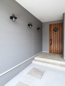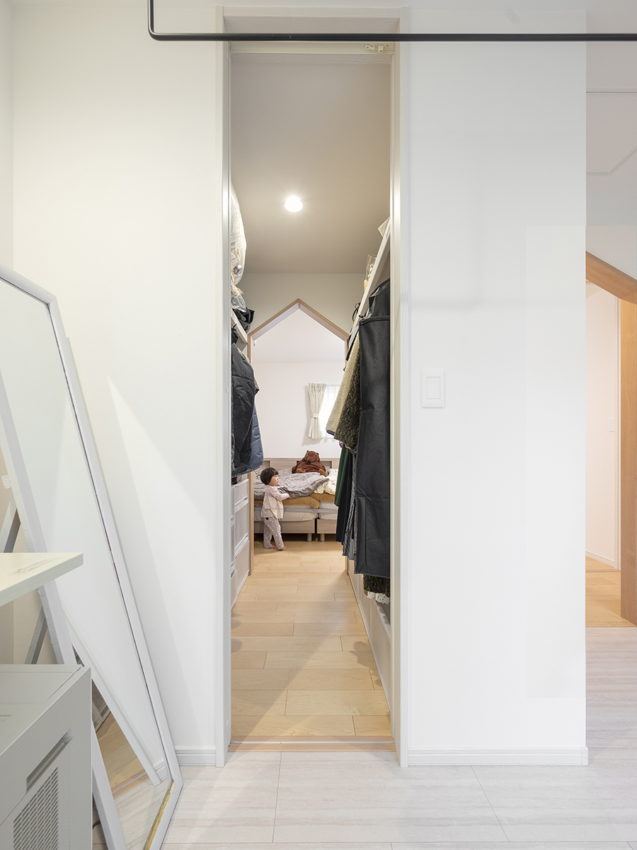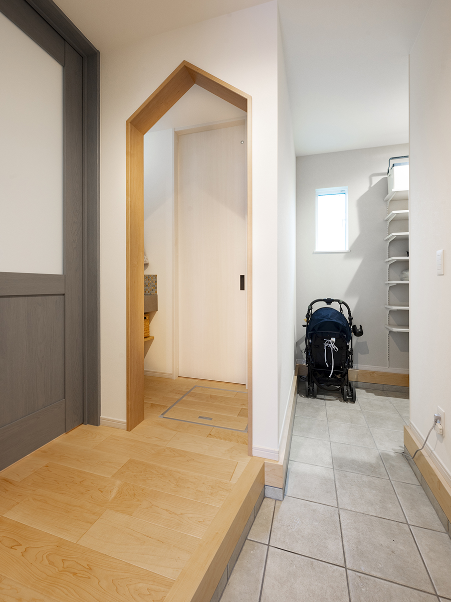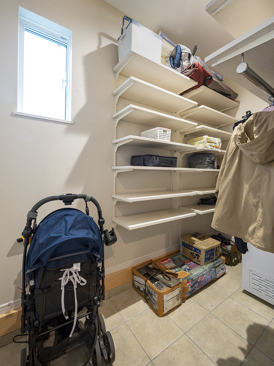 「ただいま手洗い」につながる三角屋根がモチーフの垂れ壁は、玄関の可愛らしいアクセント。その横のL字型の土間収納は、ベビーカーやキャンプ用品なども置ける大容量。ハンガーパイプには衣類も掛けられます。ガレージの奥には外部倉庫も設けるなど、豊富な収納を確保しました。