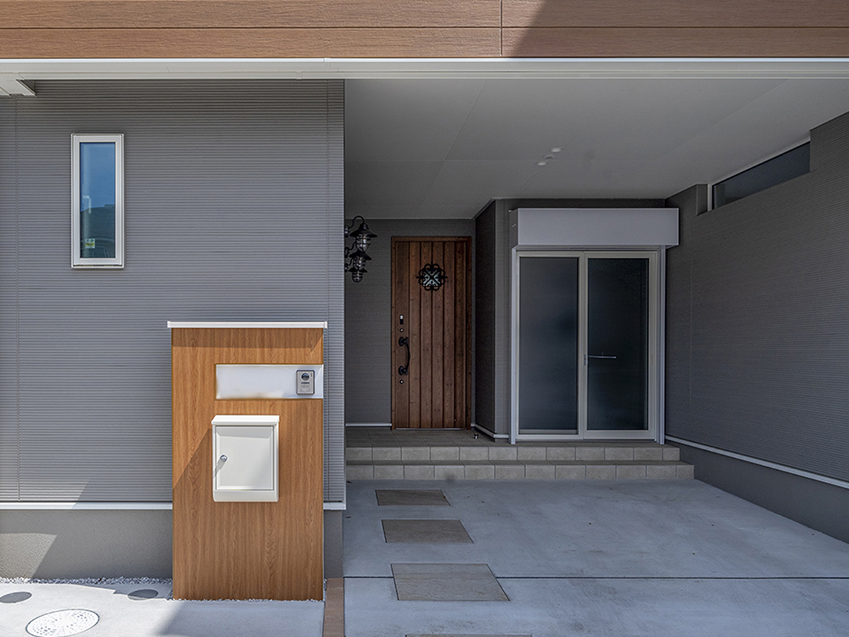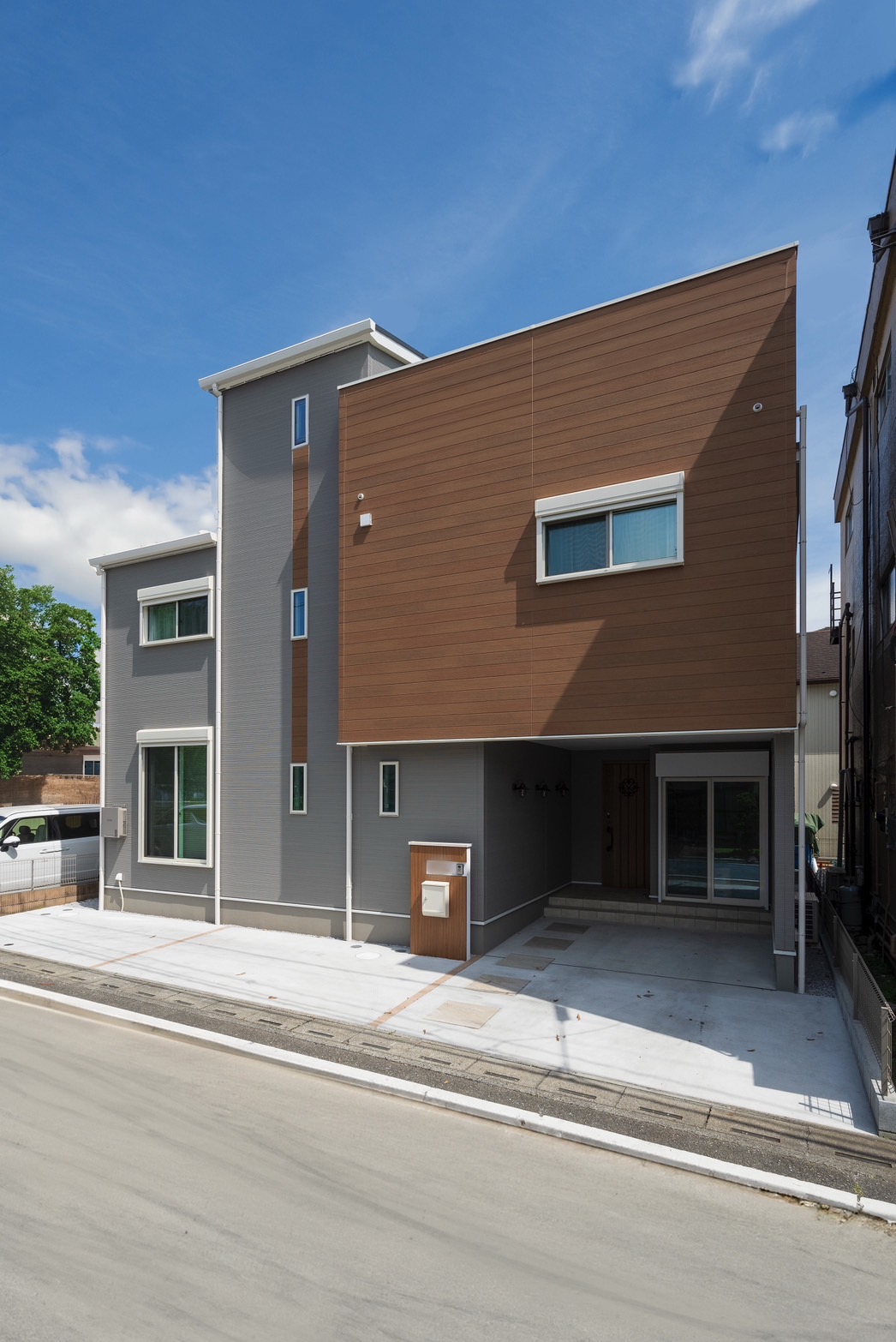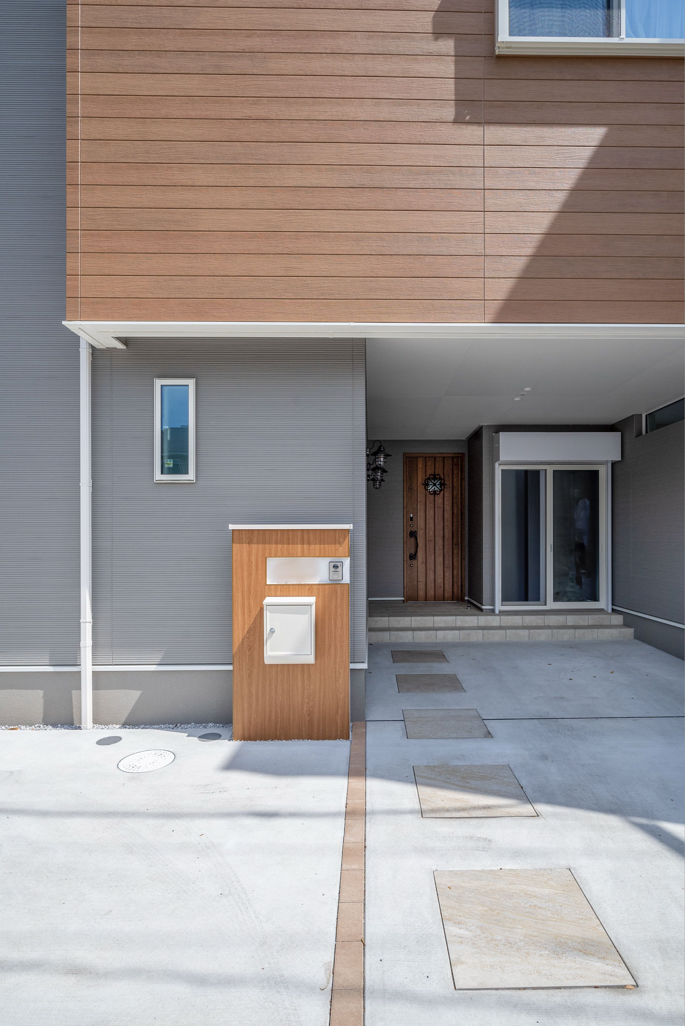 外観は、大胆なツートンカラーと凹凸のある立体的なデザインが豊かな表情です。オーバーハングと奥まった配置で玄関まわりのプライバシーが確保され、雨の日の出入りもスムーズ。通りからの見映えに配慮しながら太陽光発電パネルを搭載し、ルーフバルコニーも設置しました。
