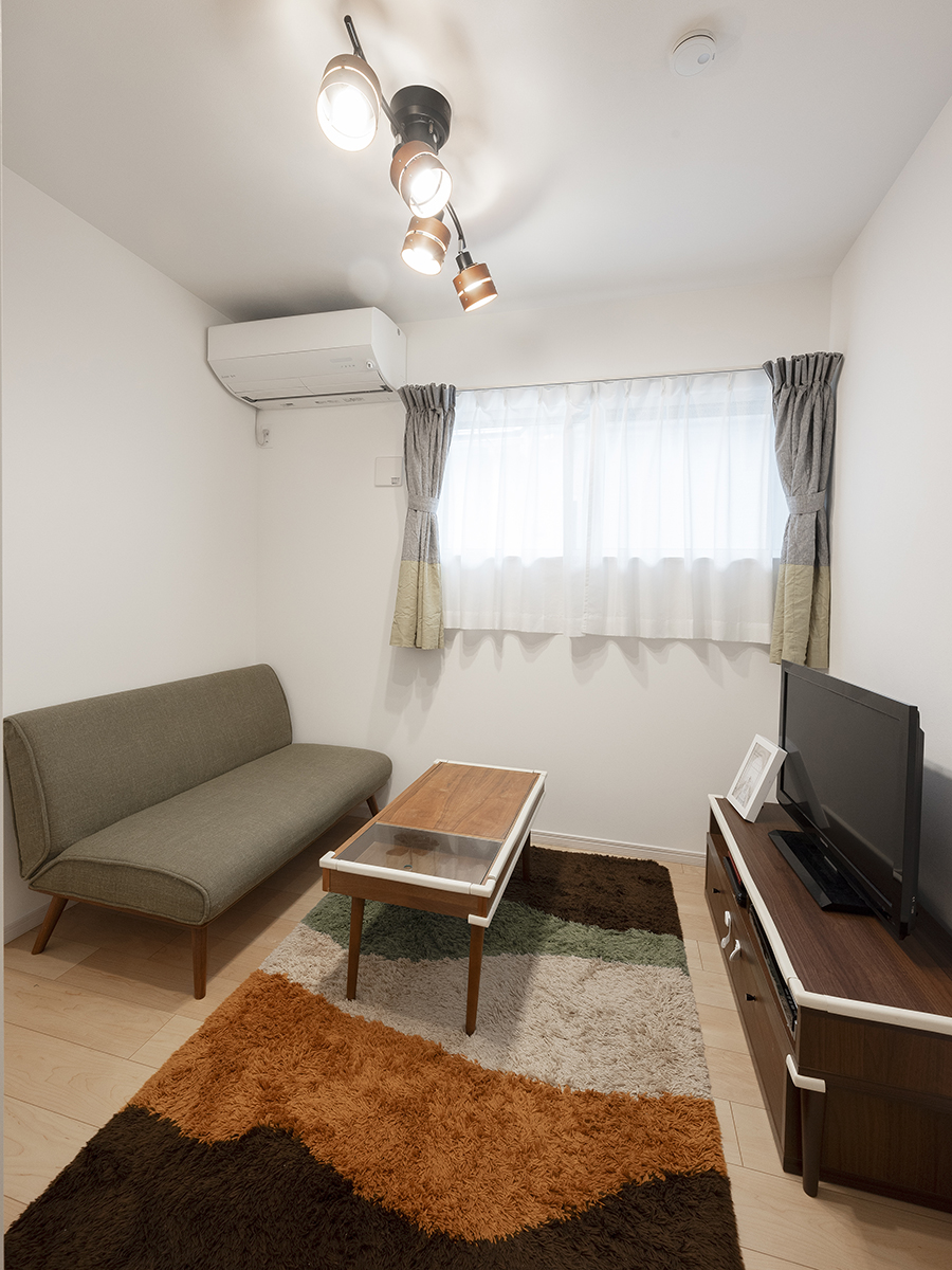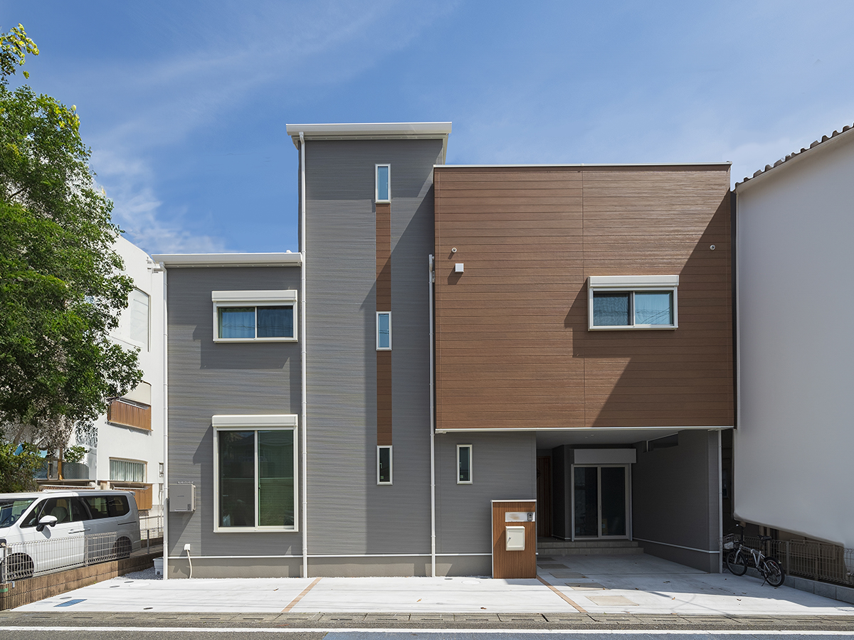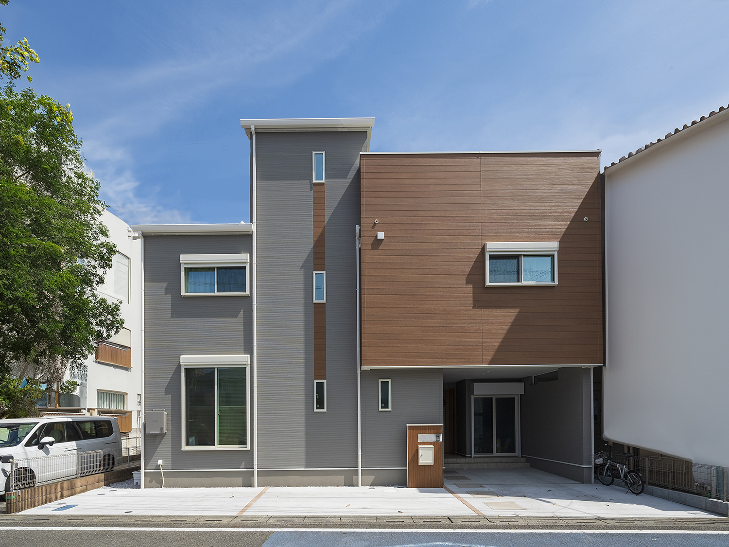 外観は、大胆なツートンカラーと凹凸のある立体的なデザインが豊かな表情です。オーバーハングと奥まった配置で玄関まわりのプライバシーが確保され、雨の日の出入りもスムーズ。通りからの見映えに配慮しながら太陽光発電パネルを搭載し、ルーフバルコニーも設置しました。