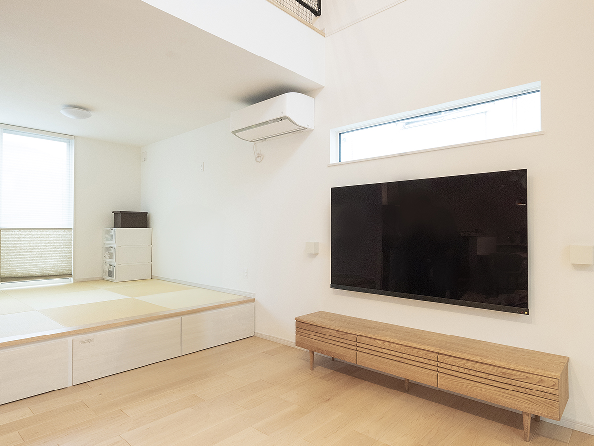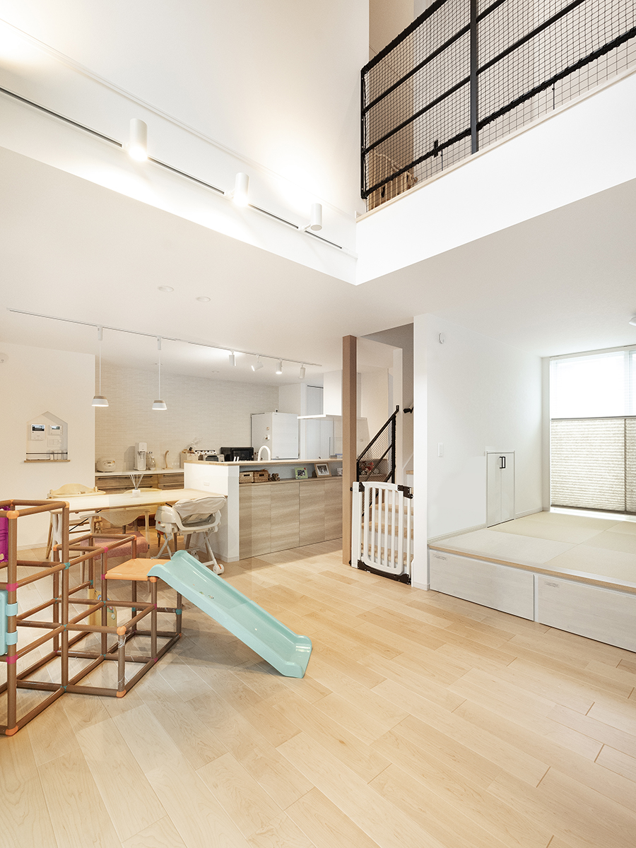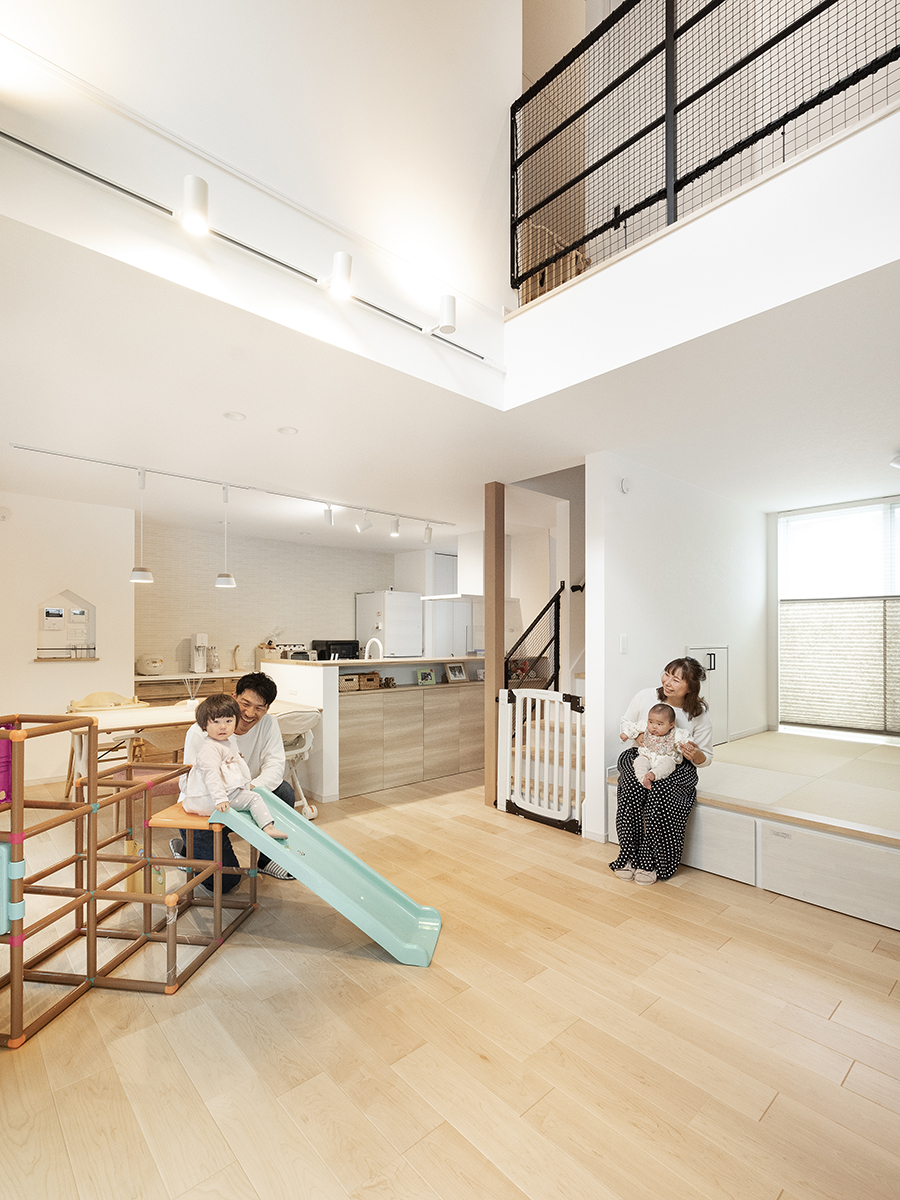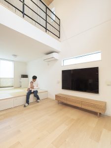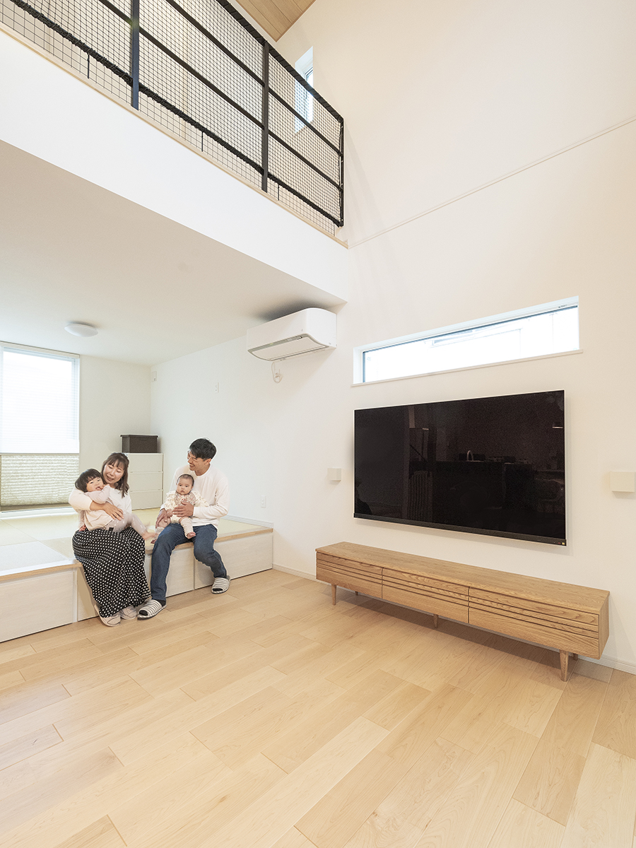 吹き抜けが開放的に広がるリビングも、高断熱なのでで、「寒い時期でも人の熱だけで暖かくなります」と奥様。空間のアクセントになっている黒い手すりは近藤建設から提案されたお気に入り。腰掛けられる高さの畳コーナーの下は引き出し収納で、リビングをスッキリ保ちます。