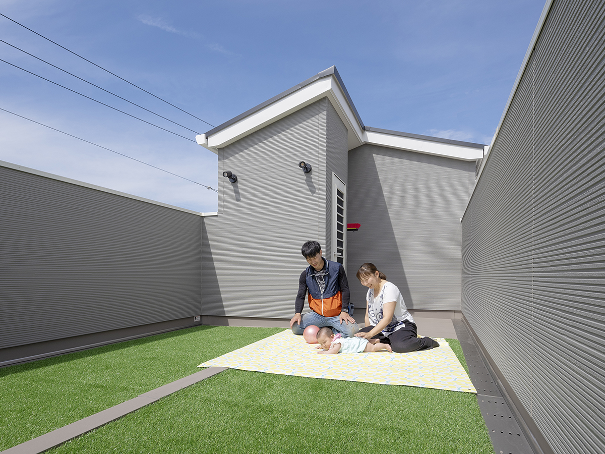「庭をなくして家を大きくして、庭の代わりにルーフバルコニーがほしい」とのT様のご希望で、広々としたルーフバルコニーを設けました。ここは、高い手すり壁で外からの視線が届かないプライベート空間。バーベキューを楽しむなど、ご家族でのびのび過ごされています。