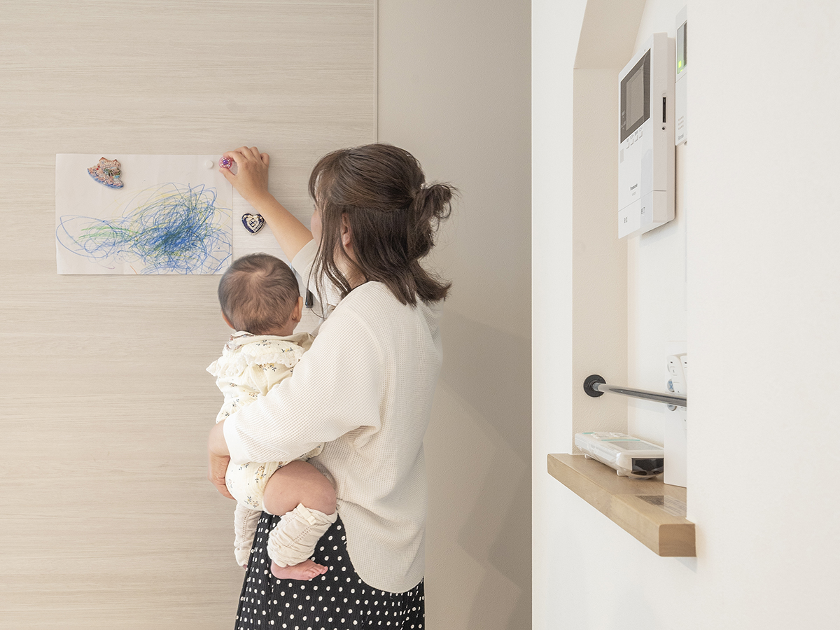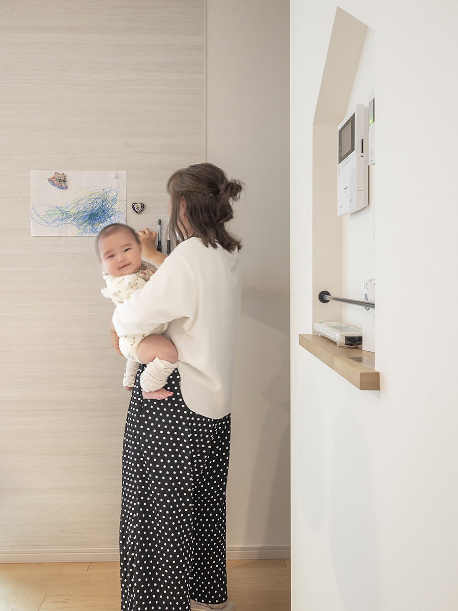 優しい色合いのナチュラルテイストのキッチンは、まわりを回遊できる動線が便利。写真などを飾れる棚や収納があるカウンターは、大工職人の造作です。キッチン横の壁にはメモなどが貼れて、お子様がお絵描きもできるマグネットボードを採用。家型ニッチにはスイッチ類をまとめました。
