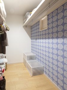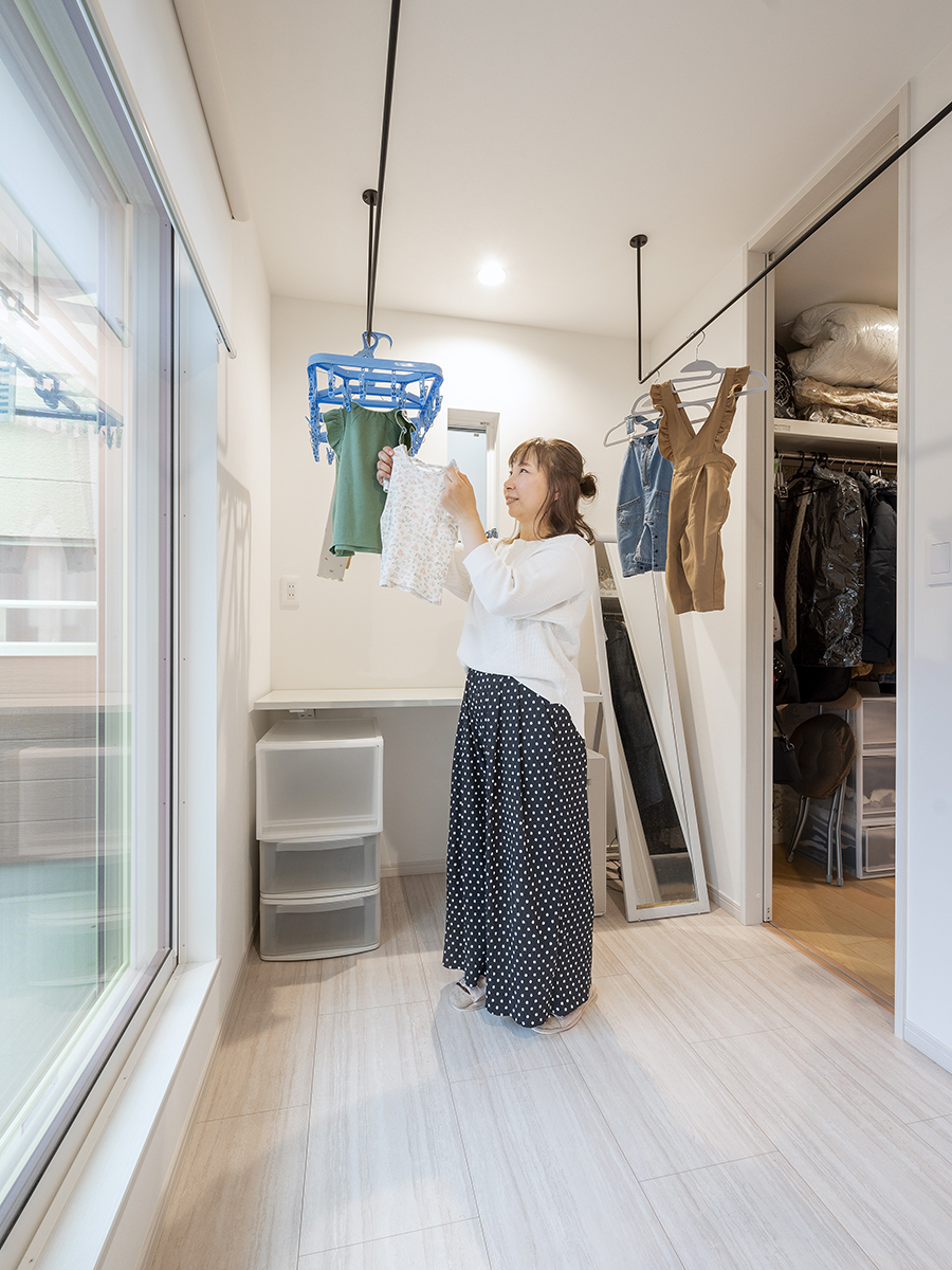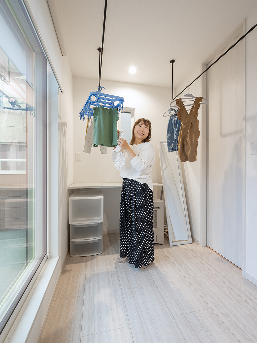 室内干しができる広々ランドリールームは、外干しでも、室内でハンガーに洗濯物を掛けてからベランダに移動させるだけなので、夏も冬も快適。乾いた衣類は隣のウォークインクローゼットに即・収納。ランドリールーム~ウォークインクローゼット~主寝室は回遊動線になっています。