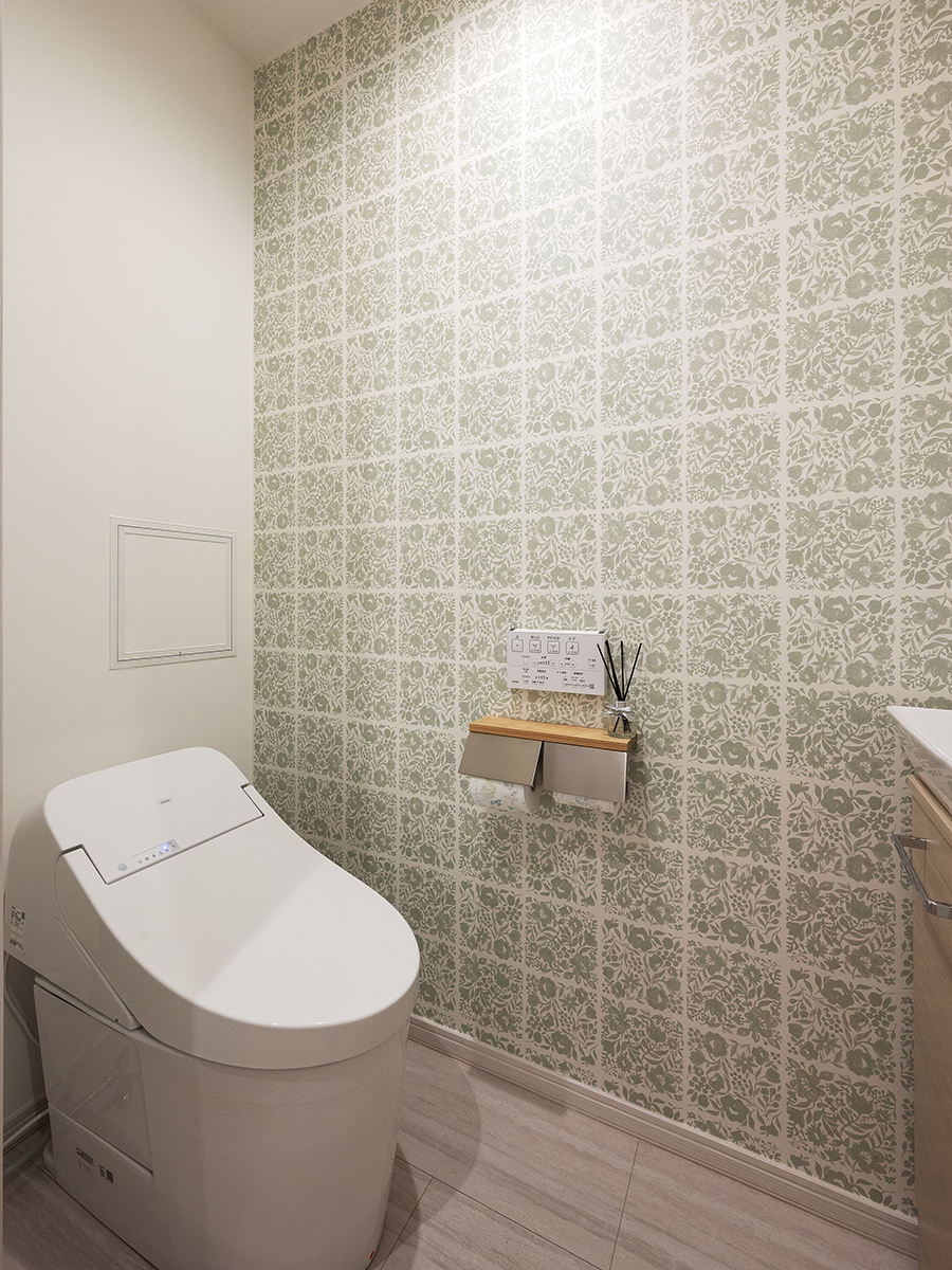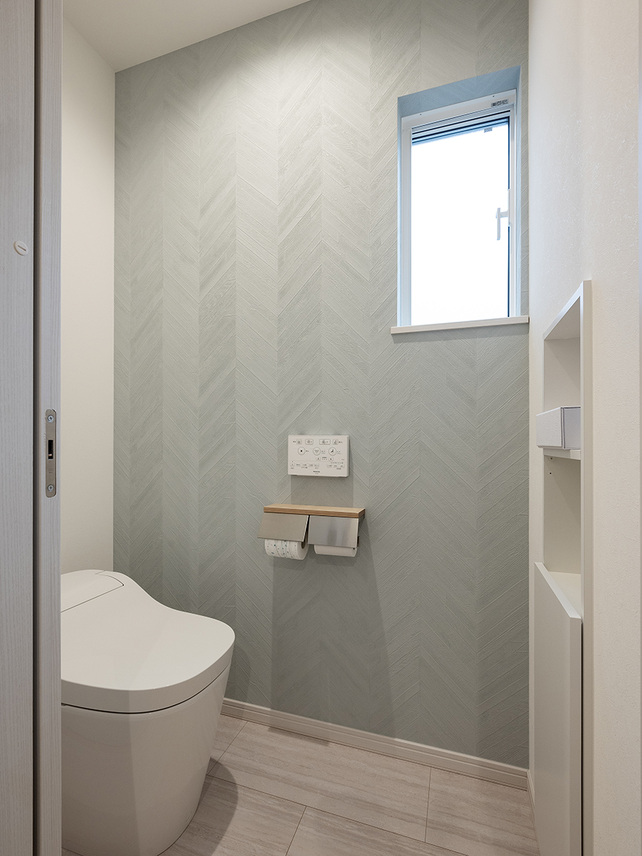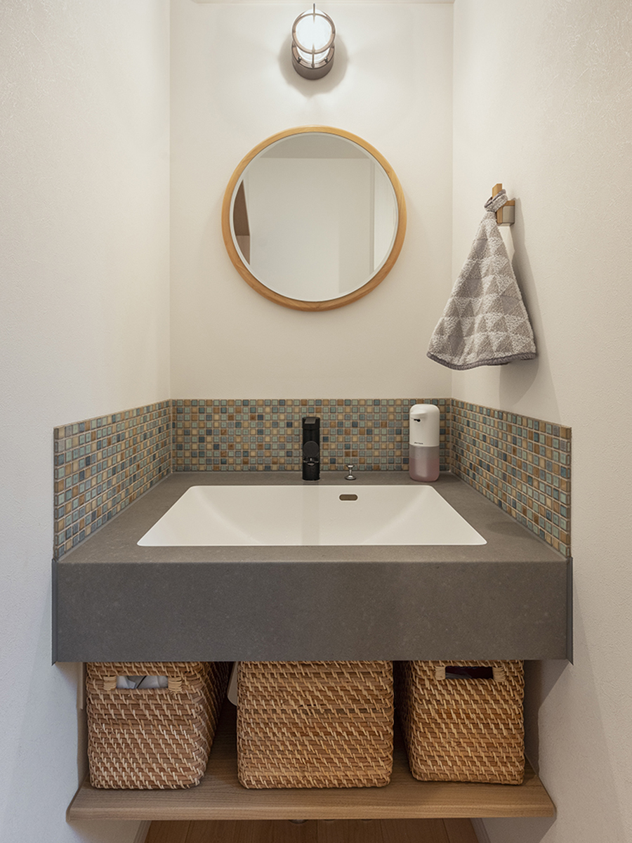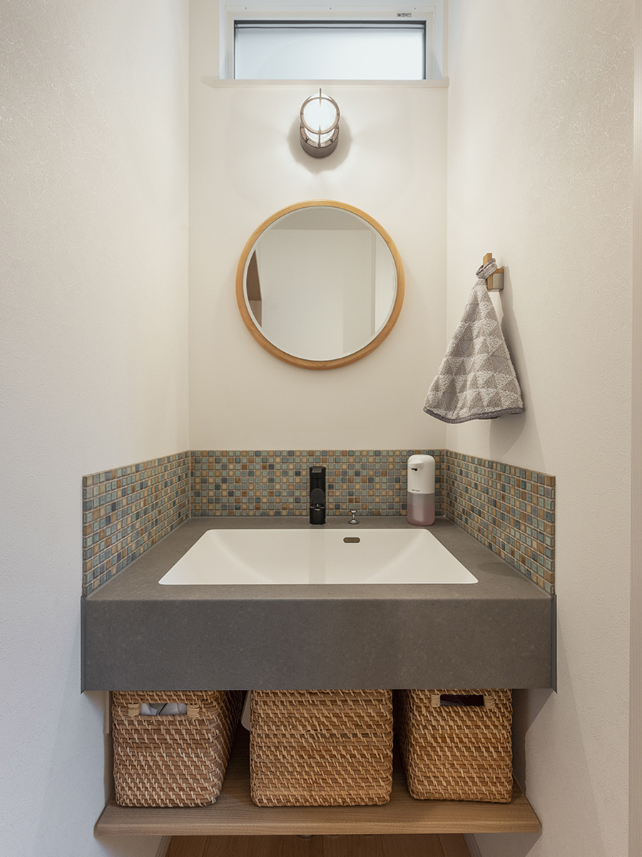 玄関横の「ただいま手洗い」は、船を思わせるマリンランプと丸窓風の鏡、モザイクタイルが素敵です。ランドリールーム内の洗面化粧台は空間に合わせた白。1階トイレはヘリンボーン柄のくすみカラーのアクセントクロスでシックに、2階トイレは落ち着いた中にも華やかなイメージに仕上げました。