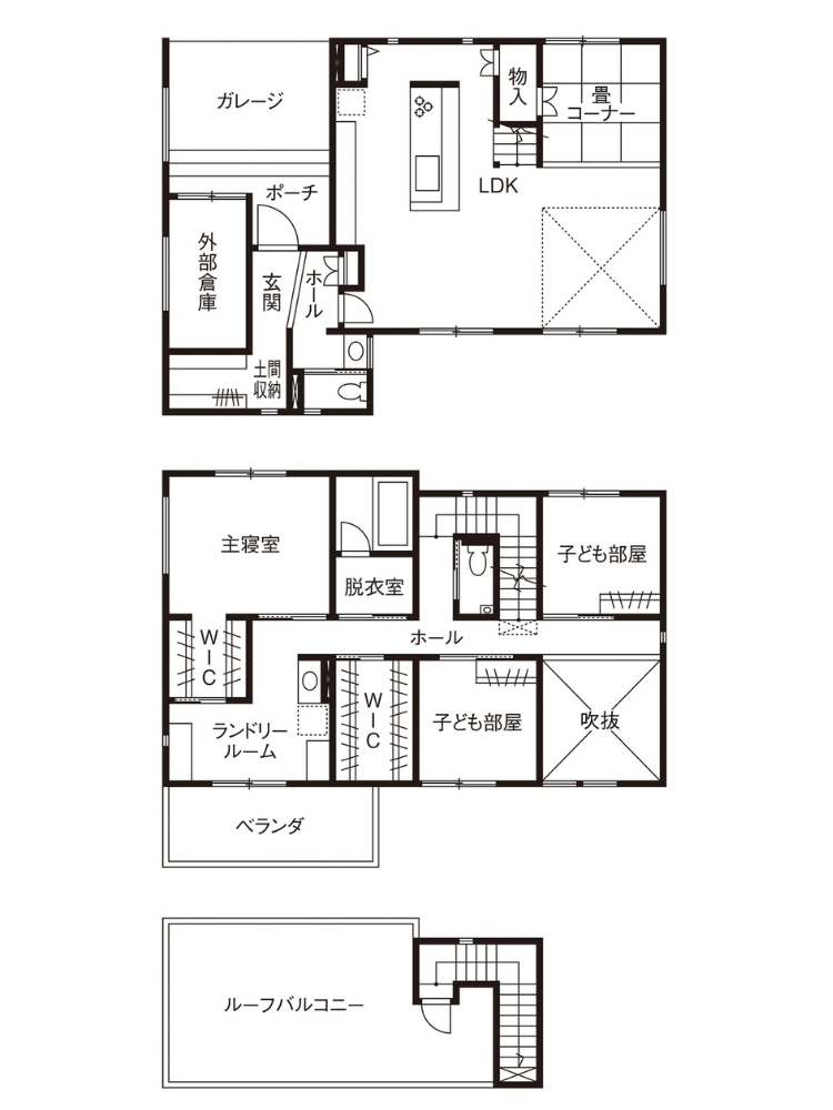 1階はLDKと畳コーナーを配置。外部倉庫や土間収納など、収納スペースも多彩です。2階は各個室と浴室などの水まわりで構成。ランドリールーム、ベランダ、2つのウォークインクローゼットが集約され、洗濯作業の大幅時短が実現しました。屋上にはルーフバルコニーも設けられています。