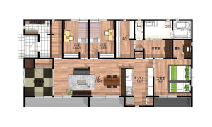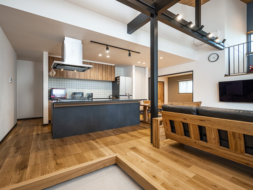 ダークな床、重厚感のある建具や家具がラグジュアリーモダンな雰囲気のLDK。キッチンはシンクとコンロを分けた2列型で、複数人でも作業しやすい広さが魅力です。