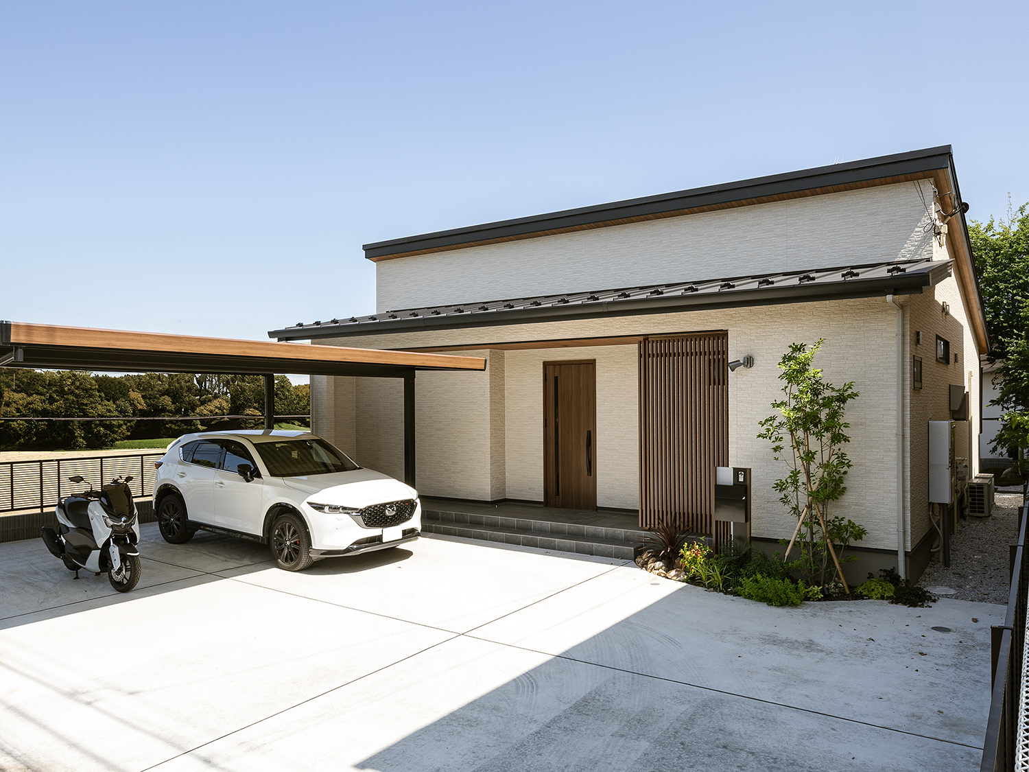 K様のご希望で軒の出を深くし、玄関も少し奥まった配置にして落ち着き感とプライバシーを確保しました。格子戸を思わせる意匠格子のコートラインは、ポーチに設けた外水栓を隠す役目も果たしています。