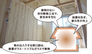 - 高断熱・高気密:吹付断熱で 夏の熱気を遮断し、冬の暖かさを逃しません。