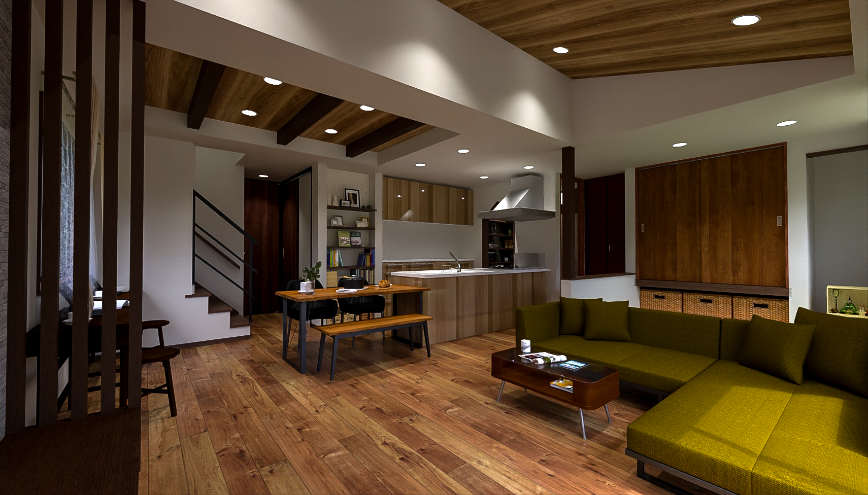 木の温もりに包まれたLDK。勾配天井と梁が、空間に豊かなゆとりをもたらします。キッチンに立てば、リビングの隅々まで見渡せる開放的な設計。どこにいてもお子様の気配が感じられる、家族の絆を育む安心の住まいです。