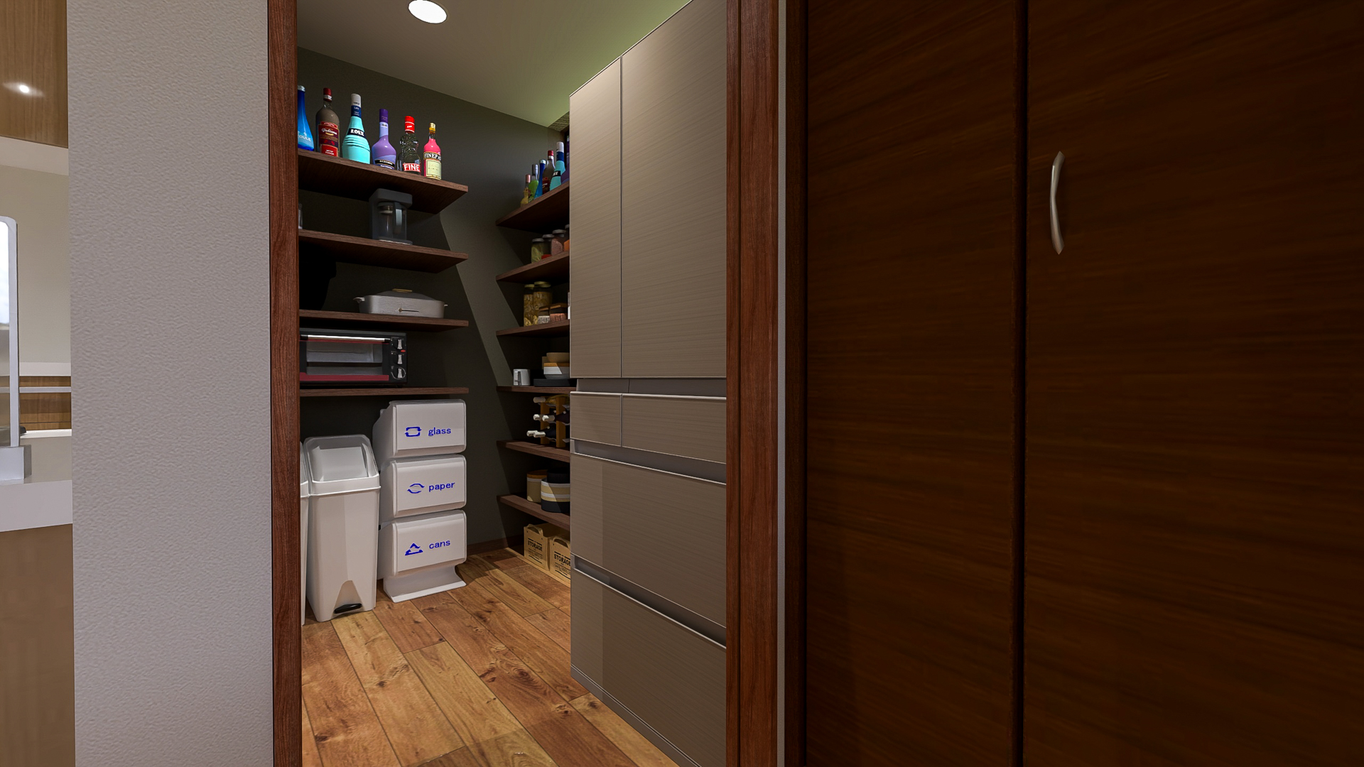 壁一面の棚には、食材から調理家電までたっぷり収まります。週末にまとめて買い出しをしても、余裕で収納できる頼もしさです。冷蔵庫やゴミ箱専用のスペースも完備。リビングからは見えにくい位置にあるため、キッチン周りを美しく保てます。