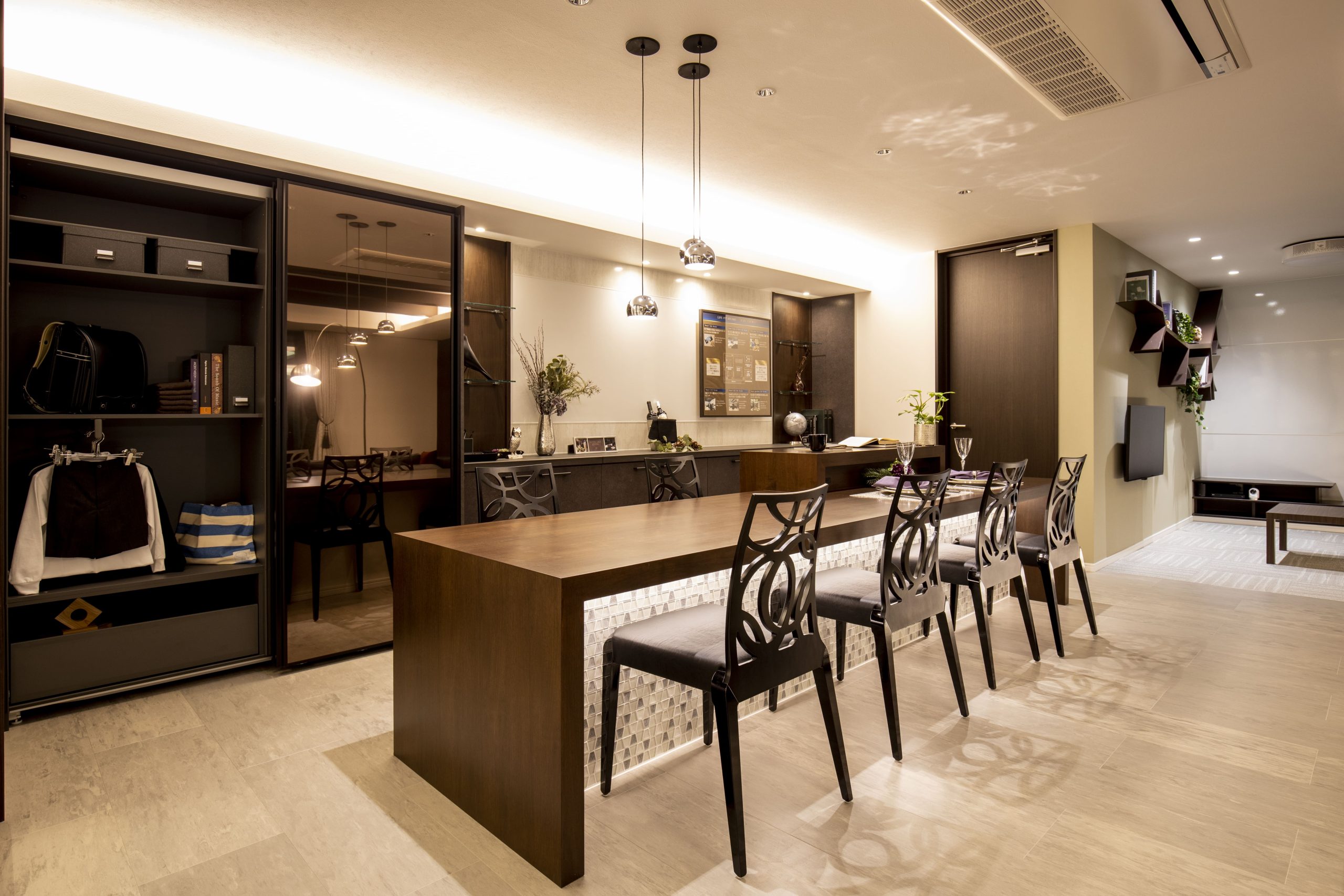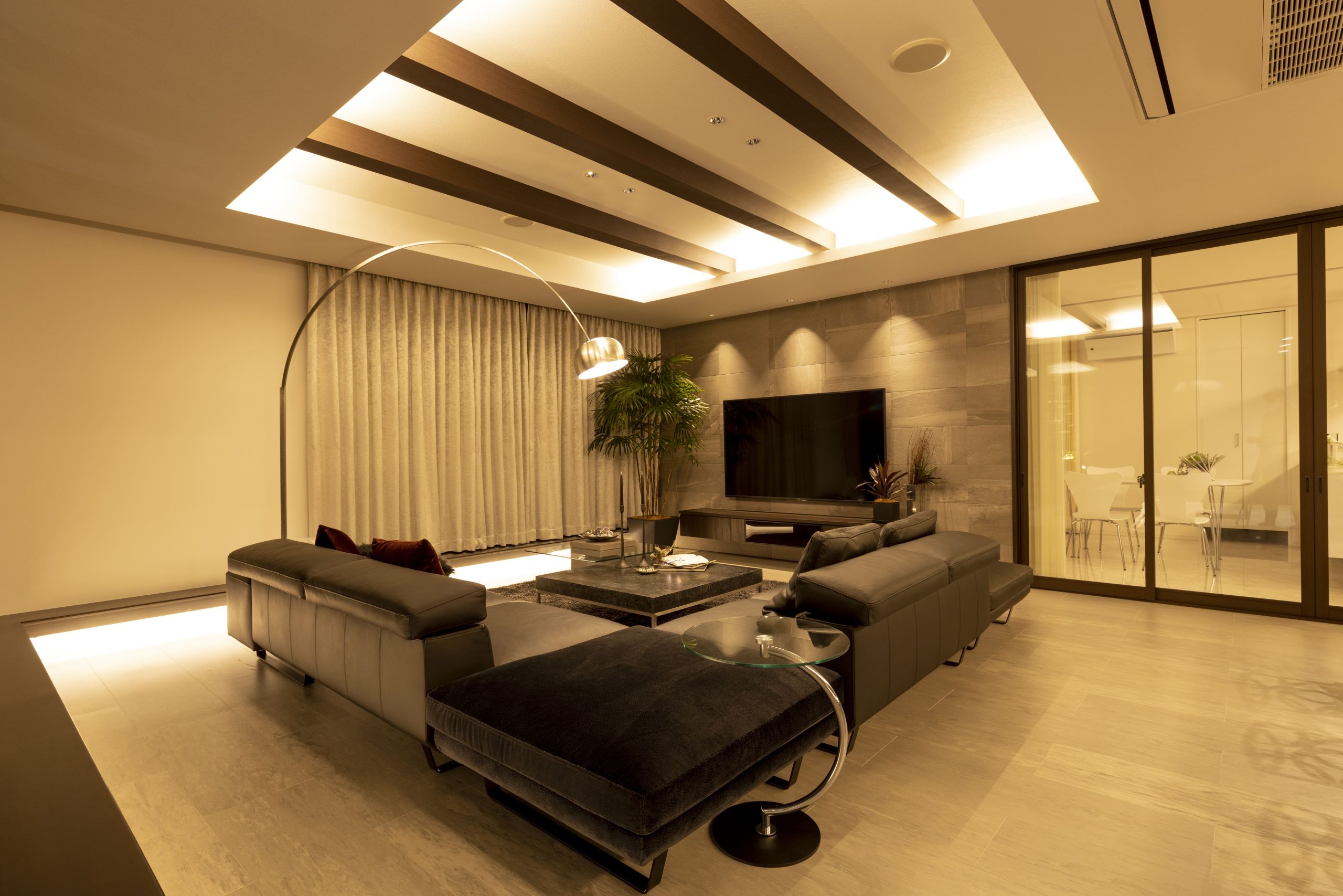 間接照明のやさしい光に包まれた、ラグジュアリーなリビング。広々とした大空間なので、家族みんなでゆったりとくつろげます。ビルも建つほどの特別な工法だからこそ叶う、縦にも横にも広がる開放感が、日々の暮らしをより豊かに彩ります。