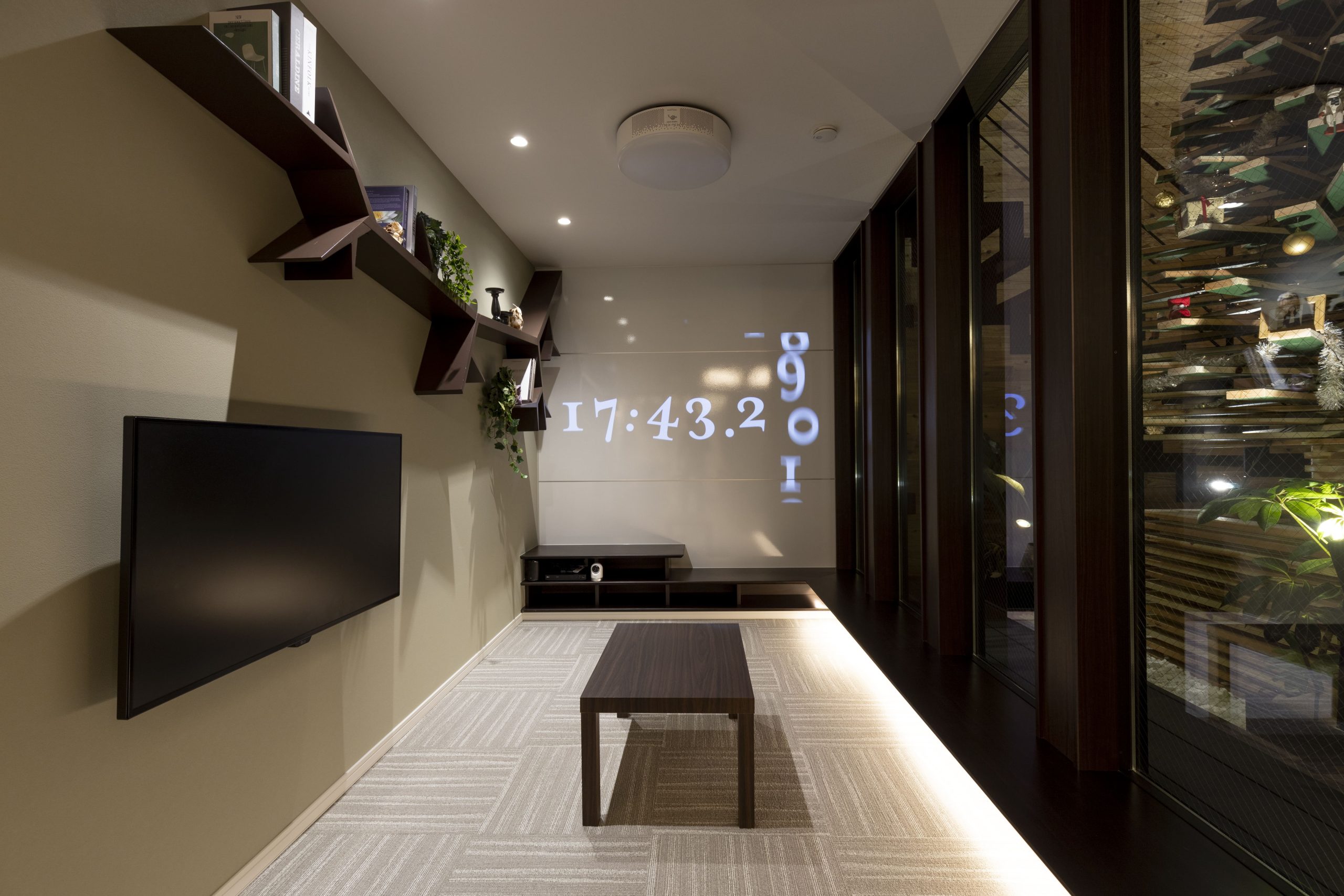 古民家風リビングには、スクリーンを設けました。畳の上でゴロゴロしながら、映画館にいるようなひとときを。また、間取りプランのご提案時には、このスクリーンでバーチャル体験ができるので、完成後の暮らしをよりリアルに想像していただけます。