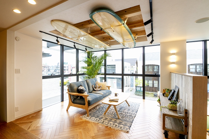アメリカや西海岸のビーチを思わせる大きな窓と高い天井、明るい光と風が似合う開放的なリビングです。濃い色の無垢材を使った床や壁、サーフボードやヤシ系の観葉植物などがアクセントになっています。