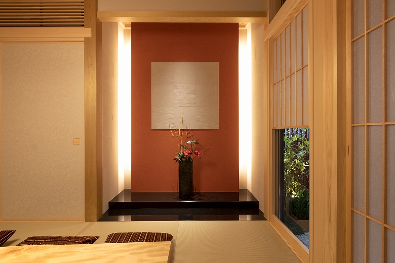 アクセントクロスと間接照明が、モダンで美しい和室を演出します。さらに、坪庭を設けたことで、自然の風景を室内にいながら楽しめます。