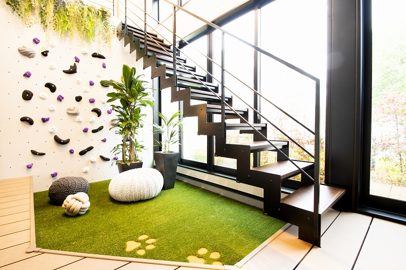 植物に囲まれた癒しの空間で、スポーツタイム!階段の下や吹き抜けを利用し、ボルダリングやヨガを楽しめるスペースにしました。季節や天気を気にせず、一年中いつでも好きな時に体を動かせます。