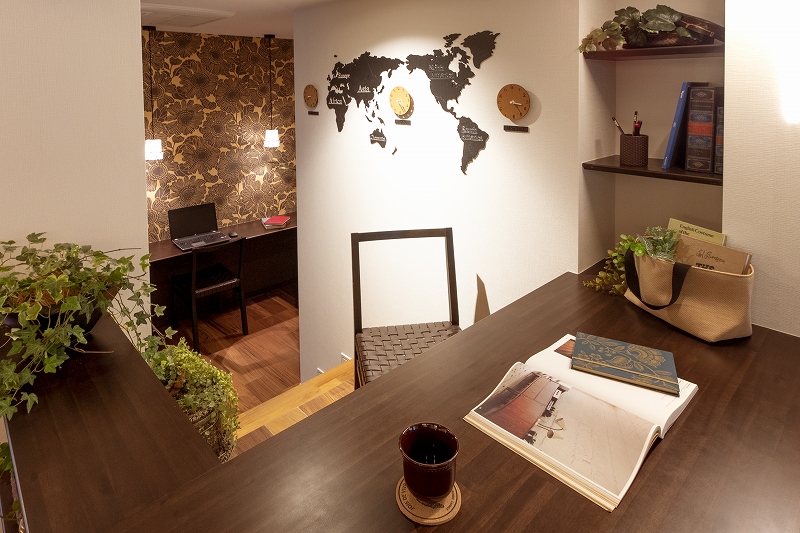 秘密の隠し扉から入れる書斎。小上がりのスペースからは、LDKを見渡すことができるので、家族の気配を感じながら、仕事や趣味に集中できます。