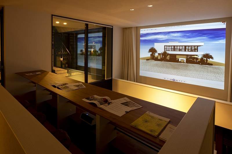 大迫力のスクリーンで、まるで映画館にいるようなひとときを。吹き抜けを利用した贅沢な空間が、とっておきのシアタールームになります。また、間取りプランのご提案時には、このスクリーンでバーチャル体験ができるので、完成後の暮らしをよりリアルに想像していただけます。